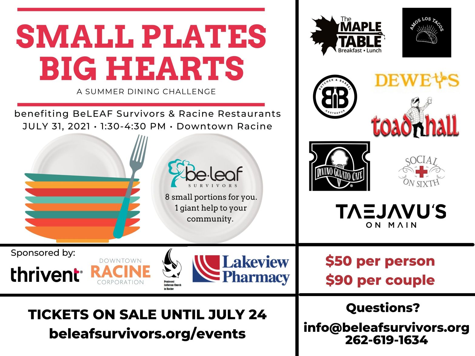 Small Plates Big Hearts is a unique and tasty fundraiser benefitting BeLEAF Survivors/Sexual Assault Services and bringing needed business to some of Racine’s hard-hit restaurants.
